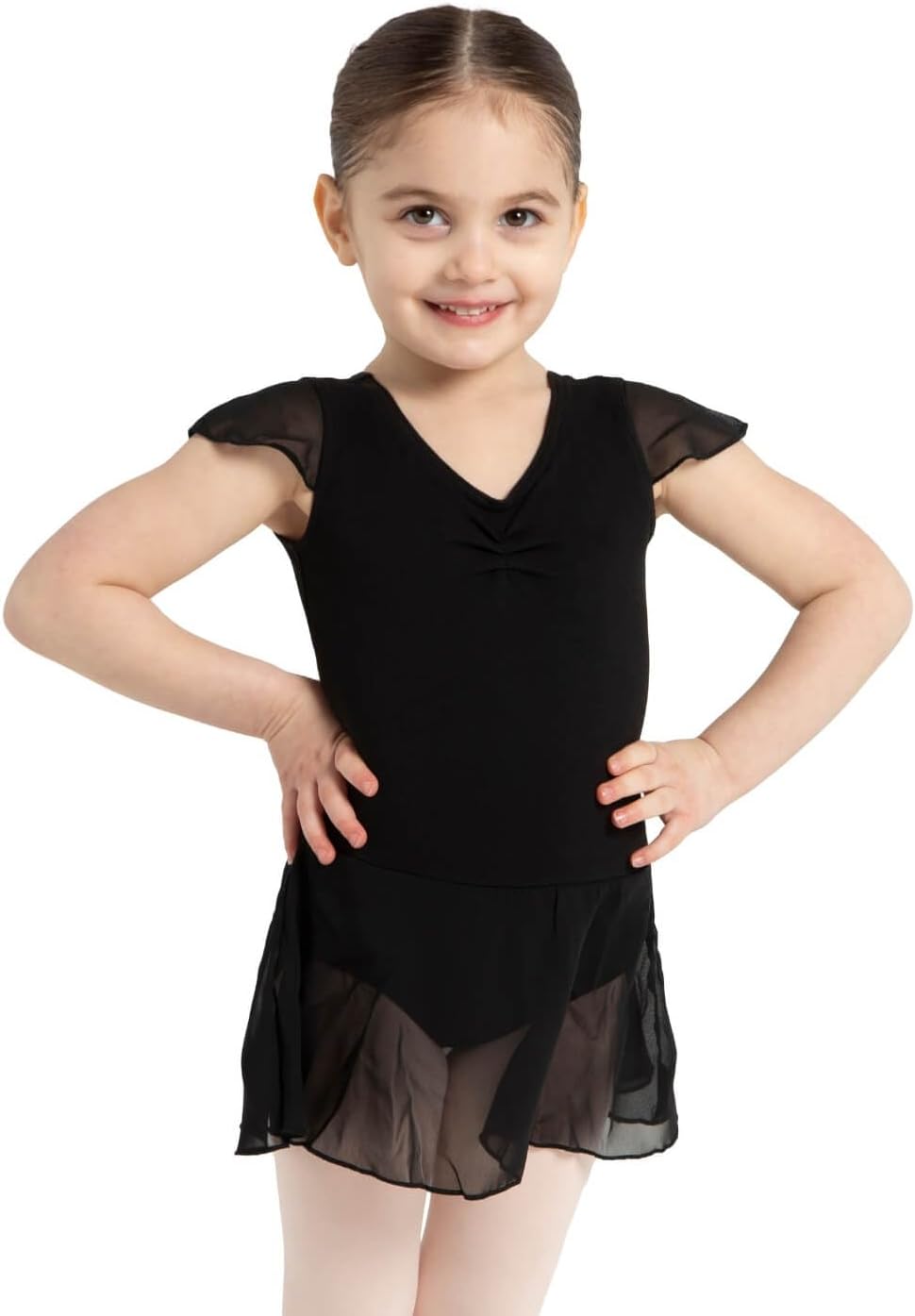 Star studded dreams are inspired by the flutter sleeve dress. This dress features a fully front lined bodice and classic scoop necklines. Chiffon flutter sleeves add style and breathability. Rising dancers will shine in this number. This dress has all the special details to make it a favorite for the ballet dancer or a fairy princess the sequin trimmed flutter sleeves and attached skirt add just the right amount of sparkle the pinched front detail and rosette detail at the waist makes this leotard very special